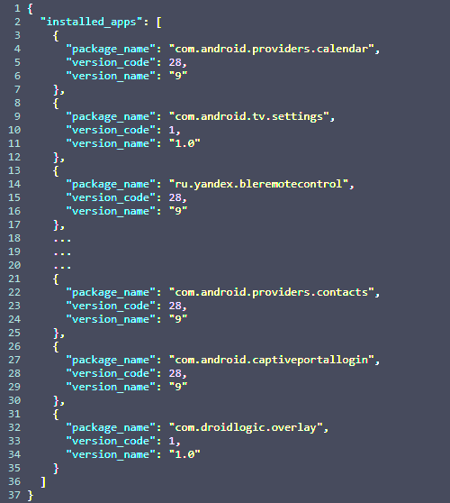 В данном примере указана только версия пакета Кинопоиска. Устройства отправляют на сервер полный список APK пакетов, независимо от Яндекса они или поставлены вручную.