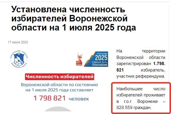 Стоит отметить, что облизбирком на регулярной основе (1 раз в полугодие) публикует данные о численности избирателей. В то же время Воронежстат, Росстат и региональное Управление ЗАГС прекратили публикацию данных о количестве граждан, проживающих в нашей области, а также о числе новорожденных и умерших. скриншот сайта облизбиркома Согласно данным облизбиркома, которые он наверняка получает от Воронежстата, за прошедший год численность избирателей сократилась на 9 тысяч 3 человека. Тогда, на 1 июля 2024 года, численность избирател