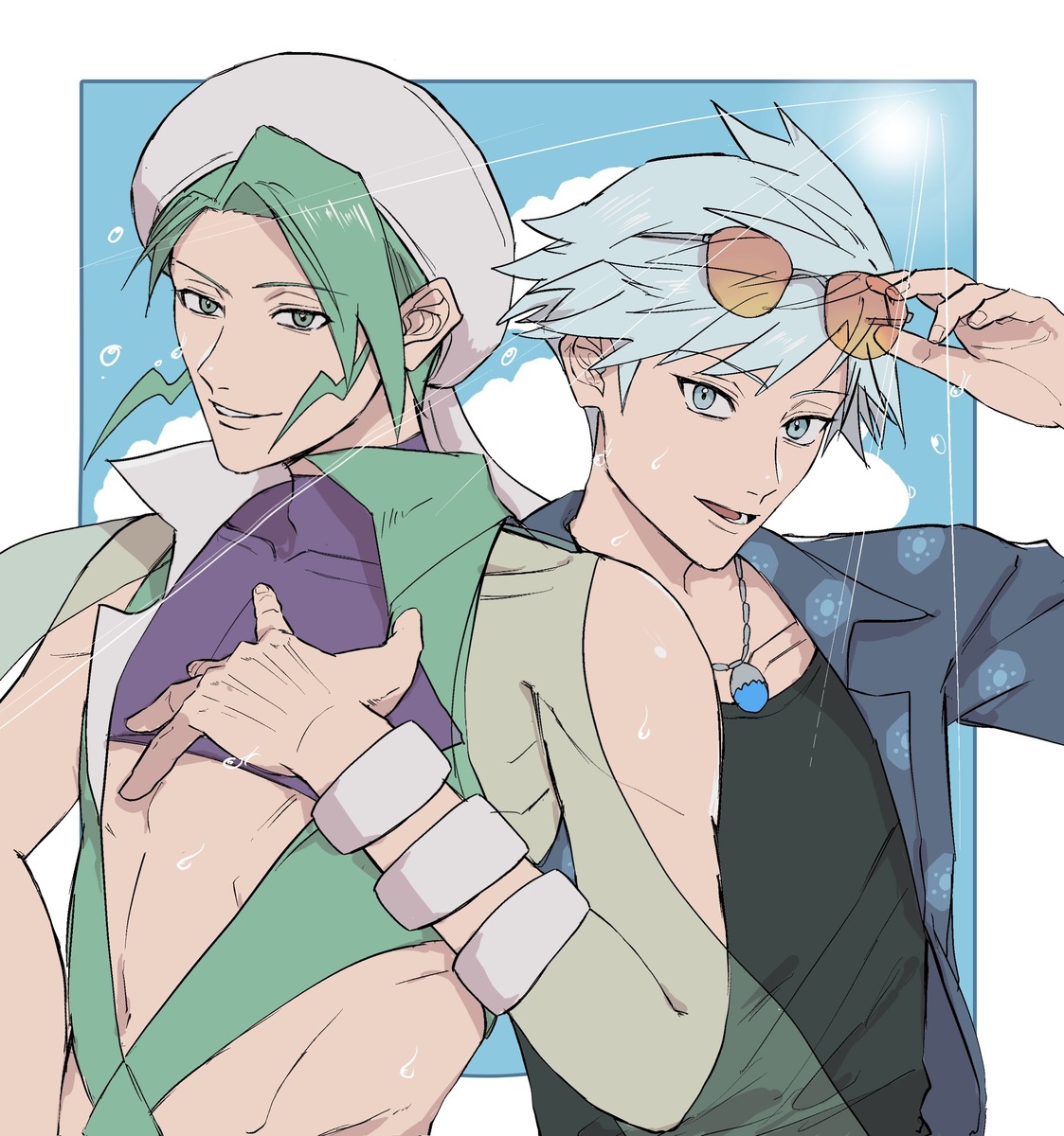 🎨 Художник: sinm_i @PokePikaProject ✏️ Теги: #2boys #adjusting_eyewear #arm_up #bare_shoulders #black_shirt #blue_eyes #blue_hair #blue_shirt #border #clothing_cutout #cloud #collarbone #collared_shirt #commentary_request #covered_collarbone #crew_neck #crop_top #fingernails #green_eyes #green_hair #hair_behind_ear #hat #highres #jewelry #linea_alba #looking_at_viewer #lower_teeth_only #male_focus #multiple_boys #necklace #open_clothes #open_mouth #open_shirt #orange-tinted_eyewear #outside_border #parted_bangs #pokemon #pokemon_oras #popped_collar #print_shirt #rimless_eyewear #see-through_clothes #shirt #short_hair #sinm_i #sky #steven_stone #summer #sun #sunglasses #sweat #t-shirt #teeth #tight_clothes #tinted_eyewear #upper_body #wallace_(pokemon) #white_border #white_hat #wing_collar