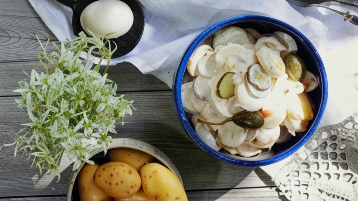 Лето — это время, когда хочется лёгкости не только в одежде, но и на столе. И если вы ищете блюдо, которое будет одновременно простым в приготовлении и по-настоящему вкусным — встречайте картофельный салат с огурцами, яйцами и сливочно-горчичным соусом . Это тот самый случай, когда обычные продукты превращаются в летний гастрономический момент . Молодой картофель с тонкой кожицей, хрустящие солёные огурчики, ароматный соус с лёгкой остринкой и нежные яйца — всё это вместе создаёт ощущение уюта и праздника. А если подать его с жареными сосисками или рыбой — ваши гости оценят по достоинству и обязательно попросят рецепт. 🧾 Что понадобится: Основа: Молодой картофель — 6–8 шт. (размером с грецкий орех, с тонкой кожицей) Солёные или малосольные огурцы — 2 шт. Яйца вкрутую — 3 шт. Крупные маринованные каперсы — 6 шт. (или горсть мелких) Для соуса: Сметана (жирная) — 2 ст. л. Майонез — 3 ст. л. Дижонская горчица — 2 ч. л. (по желанию больше) Маринад от огурцов или каперсов — 1–2 ст. л. Кефи