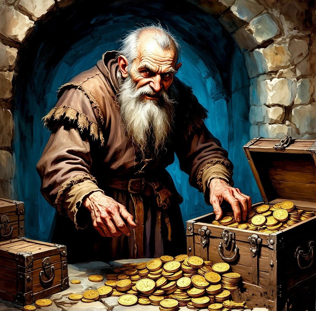 - «Повесть о Брутворте» из «Кентерберийских рассказов» Чосера. В этой повести есть эпизод с рыцарем, который настолько помешан на своем золоте, что прячет его в постели и спит на нем, постоянно пересчитывая.