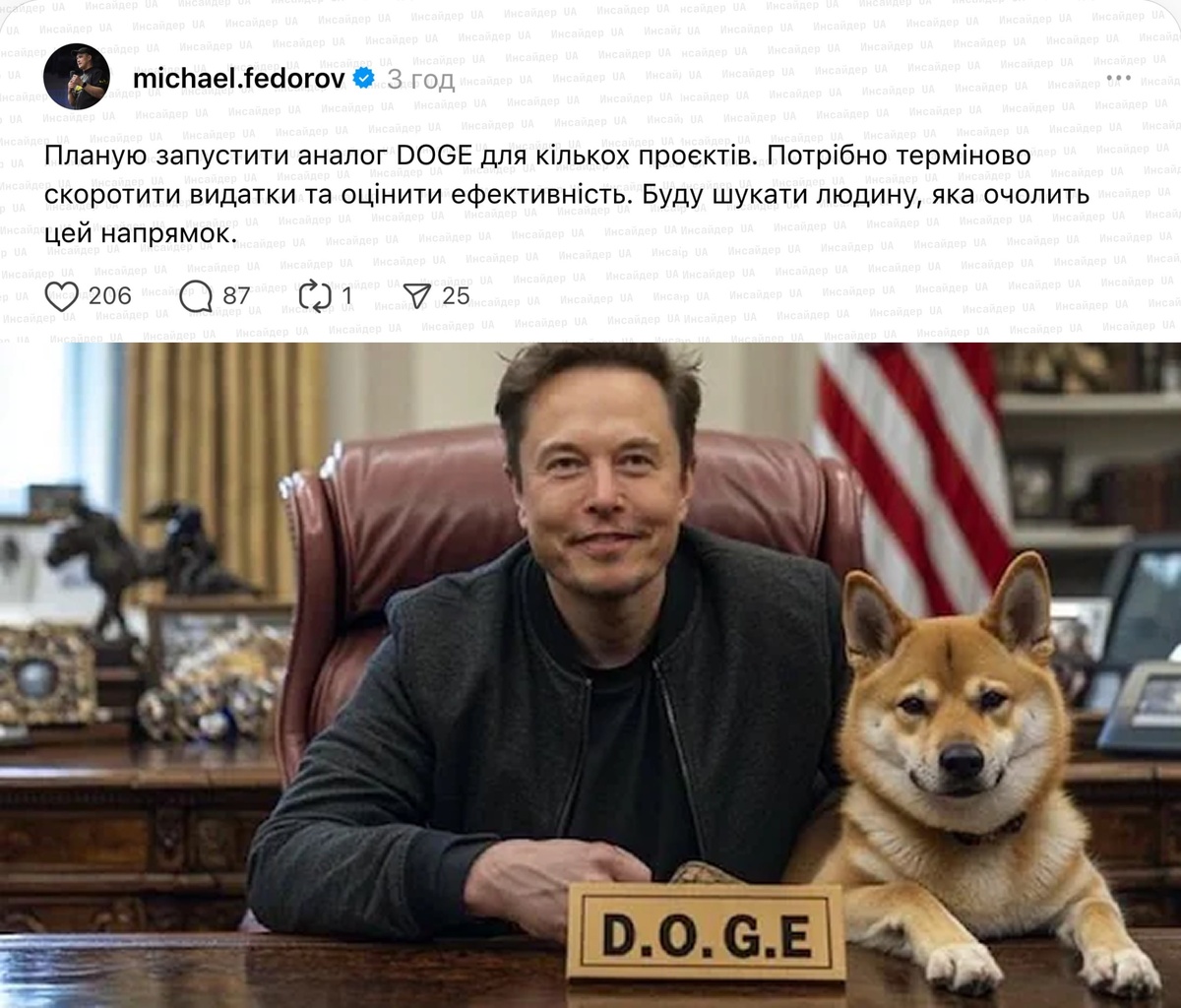 Стало известно, что недавно назначенный первый вице-премьер министр Украины из Запорожской области Михаил Фёдоров планирует создать аналог правительственного департамента эффективности, созданного Илоном Маском в США.