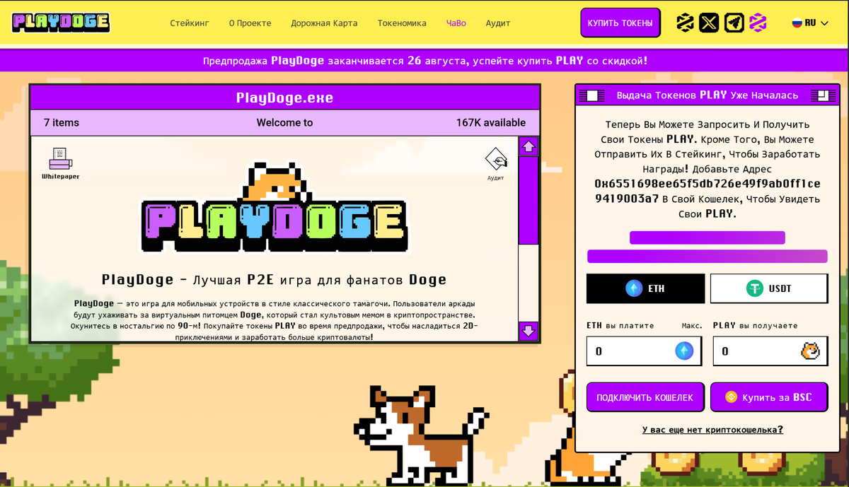 Теперь обратим внимание на игру. Сайт, на котором ее презентуют (https://playdoge.io), открыли еще в мае 2024 г. Но до сих пор игру не выложили в магазины Google и Apple, поэтому скачать ее невозможно. Зато предпродажа токенов Play ведется очень активно. Каждый желающий может их приобрести на этом этапе, который будет длиться до 26.08.2025.