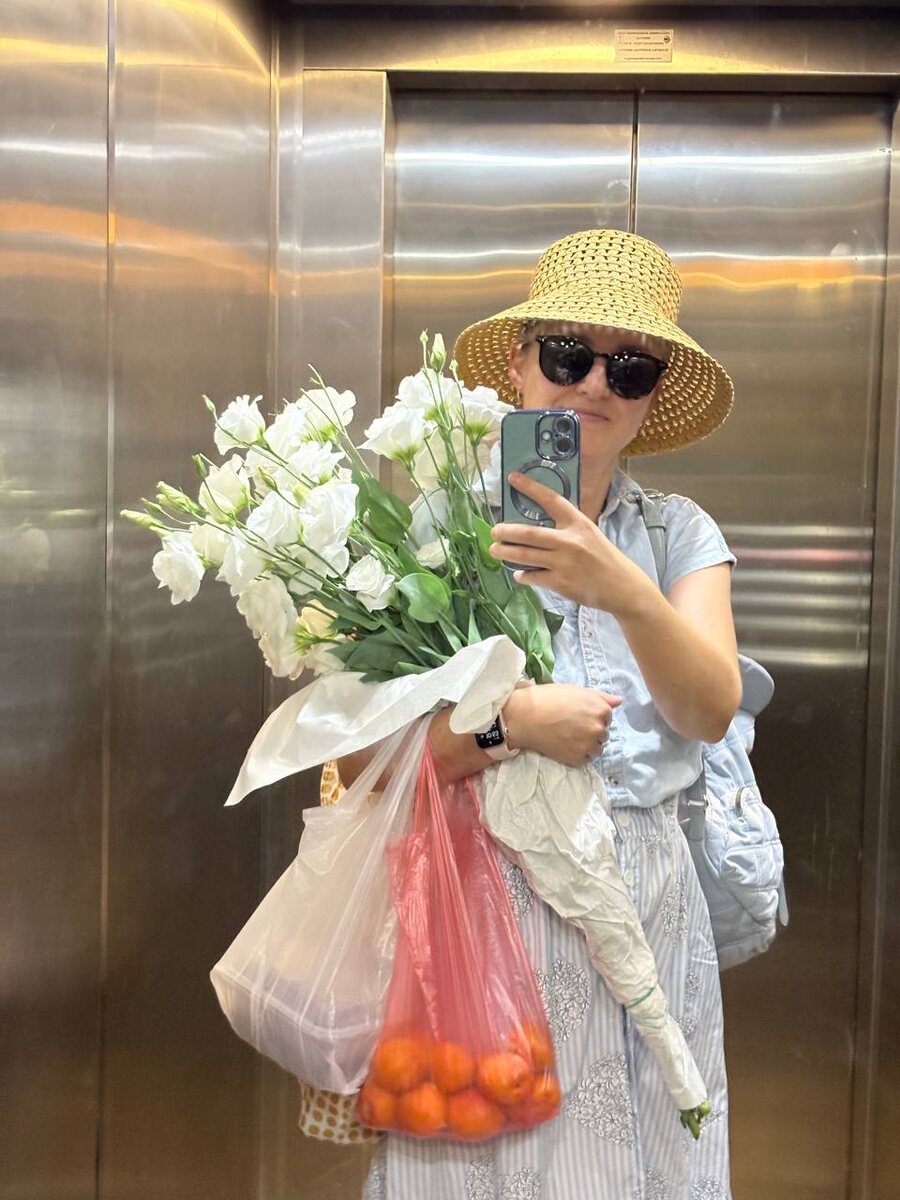 Дама в шляпе передает всем пламенный привет и хвастает новым букетом.