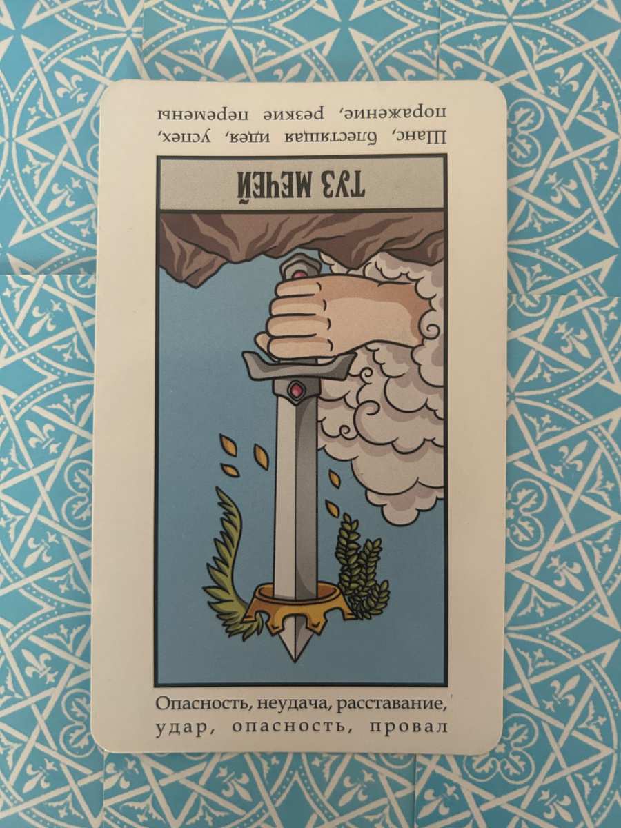 Когда разум буксует, а инсайты не доходят до головы В прямом положении Туз Мечей — это как вспышка молнии в ясном небе: всё становится резко ясно, мысли обостряются, и вы готовы разрубить любой внутренний или внешний Гордиев узел. Это аркан чистой мысли, правды, прозрения и ментального прорыва. Но что, если этот меч вдруг оказался… тупым? Добро пожаловать в мир перевёрнутого Туза Мечей. В перевёрнутом или теневом аспекте этот аркан больше похож на затупившийся нож в ящике эмоций. Вместо «Эврика!» — «Эмм... что-то не так, но не пойму что». Это когда вы вроде бы думаете, анализируете, принимаете решения — но всё не то, всё не туда, и вообще голова как в тумане. Вы можете оказаться в состоянии, когда решения не принимаются, важная информация ускользает, или всё кажется слишком запутанным. Могут быть задержки из-за неясностей, бюрократии или конфликтов на ровном месте. Здесь перевёрнутый Туз Мечей — это разговоры, после которых хуже, чем до них. Это споры без смысла, критика, обиды и по