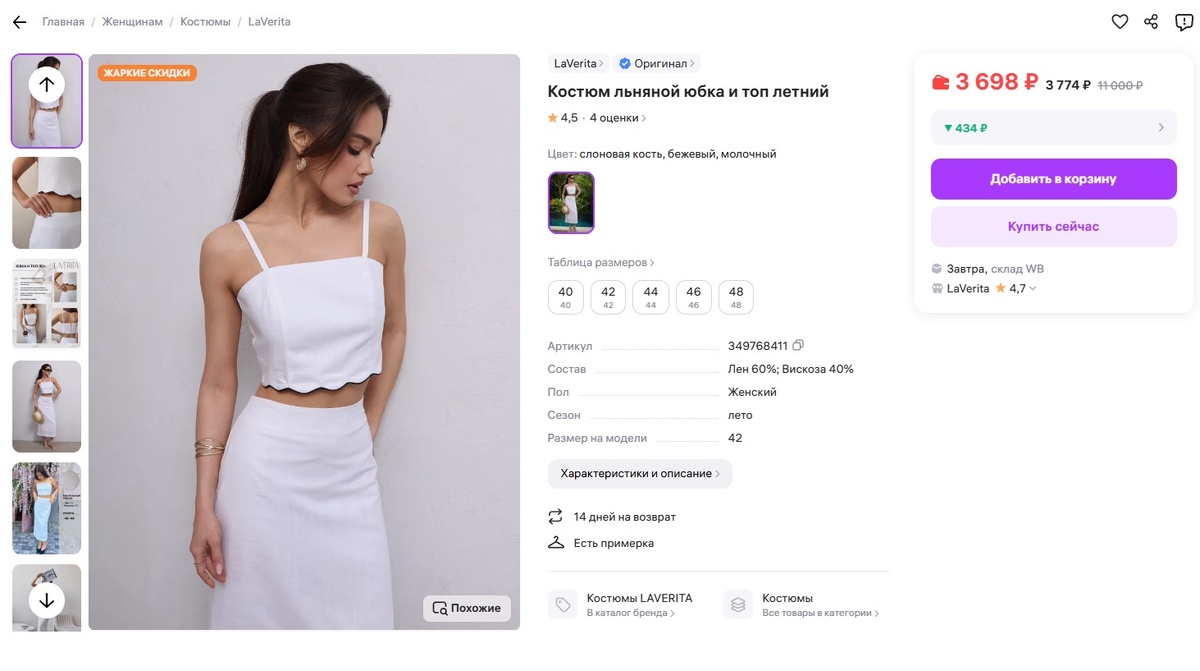 Если вы, как и я, не любите страдать от жары в синтетике и неудобной одежде значит, мы на одной волне. Я собрала подборку летних вещей, которые не просто «норм», а реально радуют в носке. Всё проверено: легко, дышит, красиво смотрится и спасает, когда +30. Особенно если хочется выглядеть опрятно, а не как варёный пельмень. Поехали? Идеальный летний комплект, когда не хочется думать, что с чем сочетать. Льняной материал с вискозой приятный к телу, юбка длины миди подчеркивает фигуру, а укороченный топ освежает образ. Можно носить на пляж, свидание или даже на летнюю свадьбу. Выглядит женственно, но при этом не жарко и не душно. Артикул: 349768411 Удобный комплект, в котором не хочется ничего менять. Свободная рубашка и бананы на резинке садятся легко и не сковывают движения. Носить можно и как костюм, и по отдельности. Цвет в точку, к любому верху