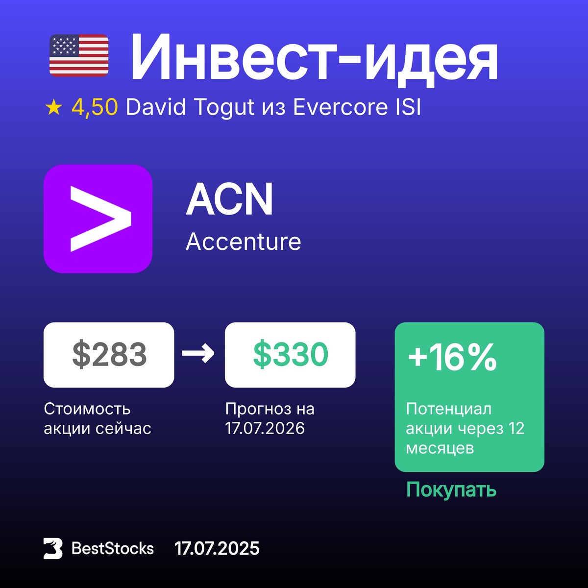 πΊπΈ ΠΠ½Π²Π΅ΡΡ-ΠΈΠ΄Π΅Ρ ΠΏΠΎ Π°ΠΊΡΠΈΠΈ Accenture Π’ΠΈΠΊΠ΅Ρ: ACN ΠΡΠΎΠ³Π½ΠΎΠ·Π½Π°Ρ ΡΠ΅Π½Π°: $330 (+16%) Π Π΅ΠΊΠΎΠΌΠ΅Π½Π΄Π°ΡΠΈΡ: ΠΠΎΠΊΡΠΏΠ°ΡΡ InvestRank Π°ΠΊΡΠΈΠΈ: 5 ΠΈΠ· 10 ΠΡΠΎΠ³Π½ΠΎΠ· ΡΠ΄Π΅Π»Π°Π½: 17.07.2025 ΠΡΠΎΠ³Π½ΠΎΠ· Π΄ΠΎ: 17.07.2026 ΠΠ½Π²Π΅ΡΡ-ΠΊΠΎΠΌΠΏΠ°Π½ΠΈΡ: Evercore ISI ΠΠ½Π°Π»ΠΈΡΠΈΠΊ: David Togut ΠΡΡ ΡΠ΅ΠΊΠΎΠΌΠ΅Π½Π΄Π°ΡΠΈΠΈ Π½Π° ΡΠ΅Π³ΠΎΠ΄Π½Ρ β β’β’β’β’β’ π’π’π’ ΠΠΎΠ΄ΠΏΠΈΡΡΠ²Π°ΠΉΡΠ΅ΡΡ Π½Π° Π±Π΅ΡΠΏΠ»Π°ΡΠ½ΡΠ΅ ΠΊΠ°Π½Π°Π»Ρ BestStocks: ΠΠΈΠ²ΠΈΠ΄Π΅Π½Π΄Ρ Π ΠΎΡΡΠΈΠΈ β’ ΠΠ½Π²Π΅ΡΡ-ΠΈΠ΄Π΅ΠΈ ΠΏΠΎ Π°ΠΊΡΠΈΡΠΌ Π‘Π¨Π β’ ΠΠΈΠ²ΠΈΠ΄Π΅Π½Π΄Ρ Π‘Π¨Π