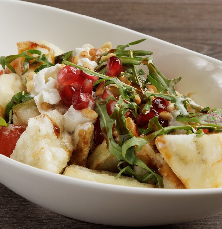 Попробуйте восхитительный салат с баклажанами и соусом Табаджан! Сочетание жареных баклажанов, свежей руколы и помидоров создает