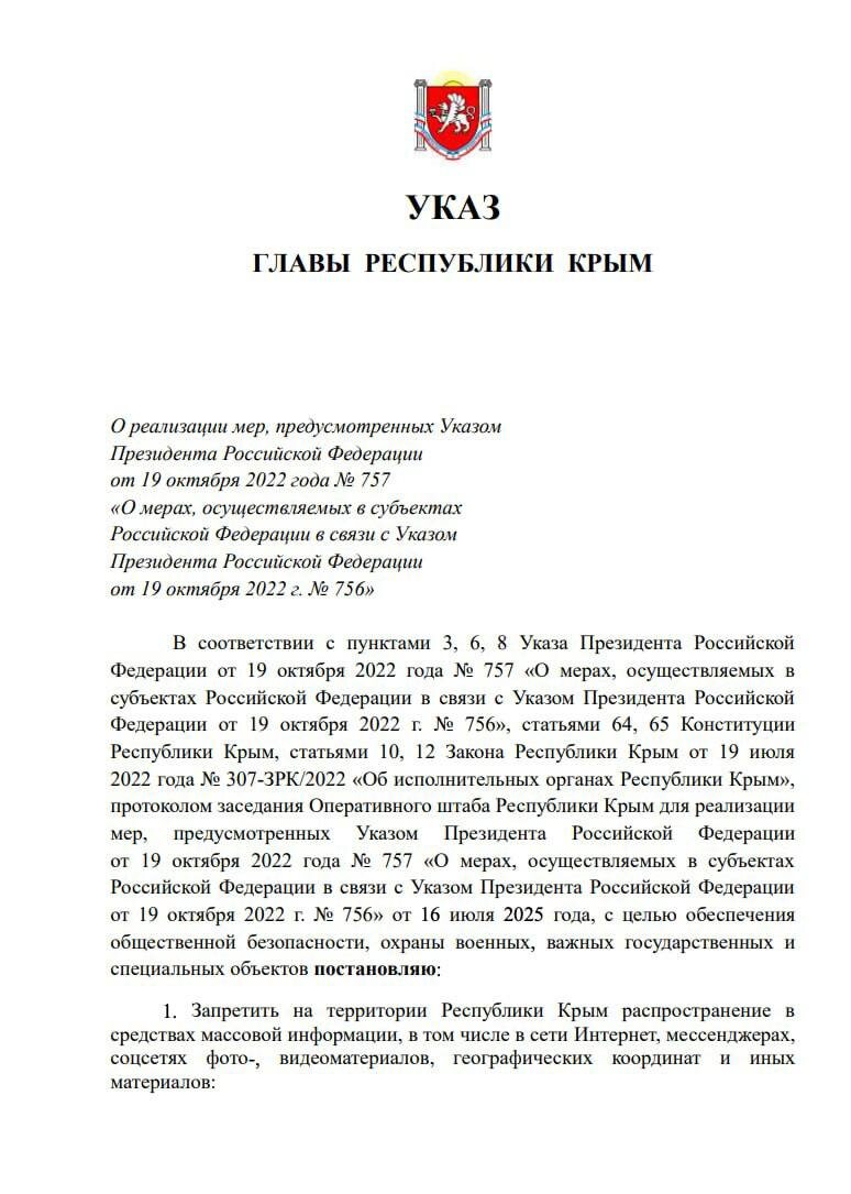 В Крыму запретили публикацию данных о прилётах, терактах и работе ПВО Власти Крыма ввели запрет на распространение информации о последствиях прилётов, терактов и других чрезвычайных происшествий. Соответствующий указ подписал глава республики Сергей Аксенов. Согласно документу, под запрет попадают фото- и видеоматериалы, географические координаты, а также иные сведения, касающиеся работы систем противовоздушной обороны, применения беспилотников и других инцидентов. Как пояснил Аксенов, мера направлена на обеспечение общественной безопасности, а также охрану военных, государственных и специальных объектов. 🤩Подписаться на «Пятую власть»