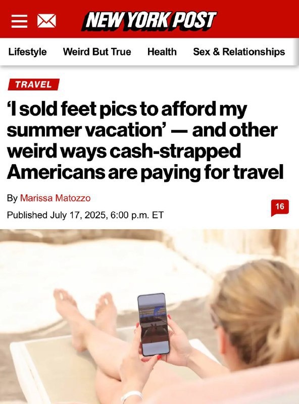 В Штатах народ придумал лайфхак, как не копить год на отпуск — массово начали продавать фотки своих ног онлайн. Офисная жизнь и бешеные цены так достали людей, что они с головой ушли в фетиш-индустрию: фоткаешь свои ножки, выкладываешь на специальный сайт — и ловишь донаты от фанатов. New York Post вообще пишет, что одна девушка таким способом закрыла весь летний отпуск — пляж, коктейли, никаких кредитов. Пора бы обновить резюме, коллеги 😒 Подробнее: https://hard-tm.su/threads/102669/ 🕹HARD-TM — Подписаться