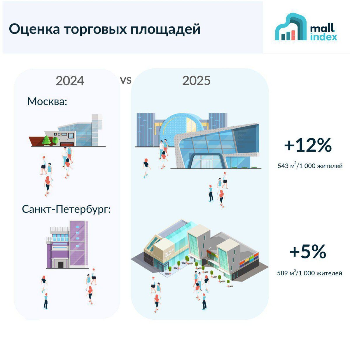 🏗 Торговая недвижимость возвращается в рост После паузы в 2024 году — в 2025-м в Москве и Петербурге резко вырос ввод новых торговых центров. Результат: 📍 Москва: +12% к обеспеченности — теперь 543 кв. м на 1 000 жителей 📍 Санкт-Петербург: +5% — до 589 кв. м на 1 000 жителей 🛍 Девелоперы наверстывают отложенные проекты, а ритейл расширяется — особенно в районах с накопленным спросом. На очереди — регионы. Михаил Васильев, Focus Technologies: «Рост показателя будет точечным в ряде регионов, особенно тех, где остается отложенный спрос со стороны ритейла».