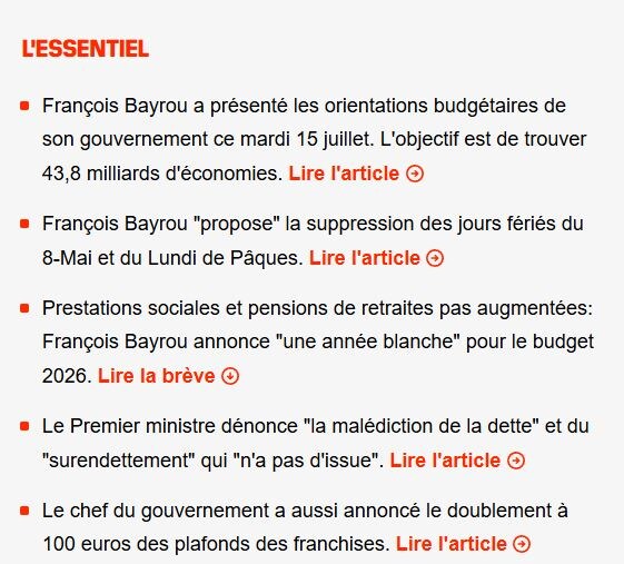 15 июля Премьер Министр Франции озвучил сумму в 43,8 миллиарда евро. Это та сумма которую нужно всеми правдами и неправдами сэкономить в 2026 году, чтобы хоть как то дать возможность Франции не сгинеть в будущем 2026 году. Выход из сложившейся ситуации Бауру нашел как нельзя оригинальный: сокращение праздничных дней: то есть официальных государственных праздников в которые французы не работают. То есть не производят материальные богатства, которые можно обложить налогами. Во Франции 11 государственных праздников, причем по традиции если вдруг эта дата попадает на выходной день, то следующий за праздничным днем понедельния является рабочим. В этом году 14 июля, День взятия Бастилии, пришелся на понедельник. Поэтому был выходной понедельник. В прошлом году 14 июля пришлось на воскресенье. И французы в понедельник 15 июля пошли на работу. Обязательно один, а то и два раза в году праздничный день попадает на выходные. Это значит, что никогда все 11 дней страна не отдыхаеит. Максимум 9, а т
