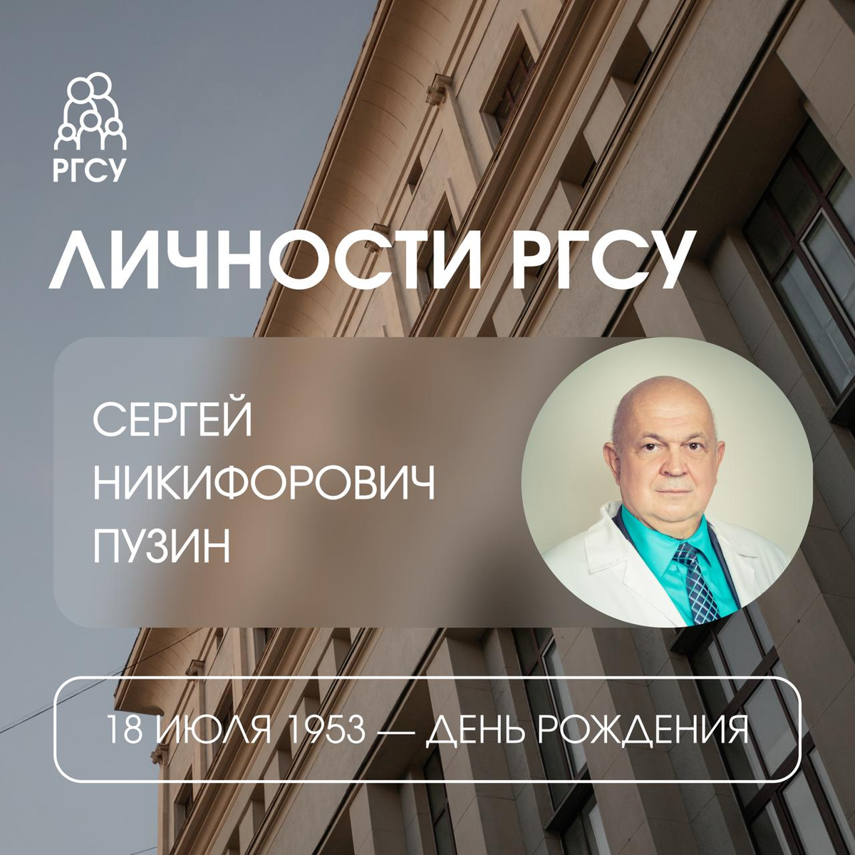 18 июля 1953 года родился советник ректора РГСУ, академик РАН, профессор Сергей Никифорович Пузин. В 1975 году он окончил Первый Московский медицинский институт им И.М.Сеченова по специальности «лечебное дело». В 2005 году окончил Академию менеджмента инноваций Москвы по специальности «менеджмент организации». После окончания аспирантуры работал в ЦНИИ экспертизы трудоспособности и организации труда инвалидов (ЦИЭТИН), пройдя путь от младшего научного сотрудника до директора. С 1995 года — заместитель директора НИИ экспертизы трудоспособности и организации труда инвалидов Минтруда РФ, в 2000–2004 гг. — генеральный директор Федерального научно-практического центра медико-социальной экспертизы и реабилитации инвалидов Минсоцтруда России, в 2005–2011 гг.— руководитель ФГУ «Федеральное бюро медико-социальной экспертизы» и главный федеральный эксперт по медико-социальной экспертизе Минздравсоцразвития России, в 2011–2012 гг. — заместитель директора НИИ медицины труда РАМН. Сергей Никифорови