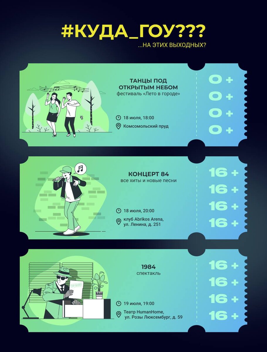 Прошла уже половина лета ⭐️А это значит только одно — у тебя есть ещё целая половина, за которую ты успеешь набраться сил вместе с мероприятиями из нашей подборки #Куда_гоу 🔹Танцы под открытым небом Любителям активного отдыха точно понравится открытый урок социальных танцев в рамках фестиваля «Лето в городе». Не важно, есть ли у вас опыт, главное - желание двигаться, чувствовать музыку и получать удовольствие. 18 июля в 18:00 на главном пирсе Комсомольского пруда. 0+ 🔹Концерт 84 Танцпол — твой выбор, если хочешь быть в эпицентре энергии. Готов к взрыву эмоций? Концерт состоится 18 июля в 20:00 в клубе Abrikos Arena по адресу: ул. Ленина, д. 251. 16+ 🔹Спектакль 1984 А для любителей постановок у нас находка — самая известная антиутопия XX века. 19 июля в 19:00 по адресу: ул. Р. Люксембург, д. 59, этаж 3. 16+ 🔹Улитка и Кит В этот же день в мастерской мюзикла Киви ты сможешь увидеть невероятную дружбу таких непохожих, но очень близких персонажей — крошечной улитки и огромного кита