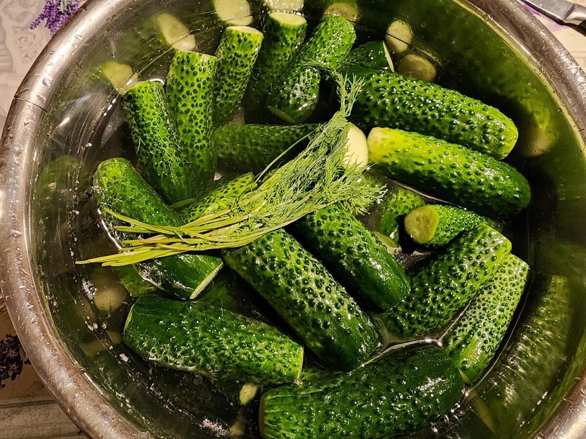 Огурцы будут вкусными, если сразу их готовить в день сбора урожая. Перед маринованием замачиваю в холодной воде на 2 часа.