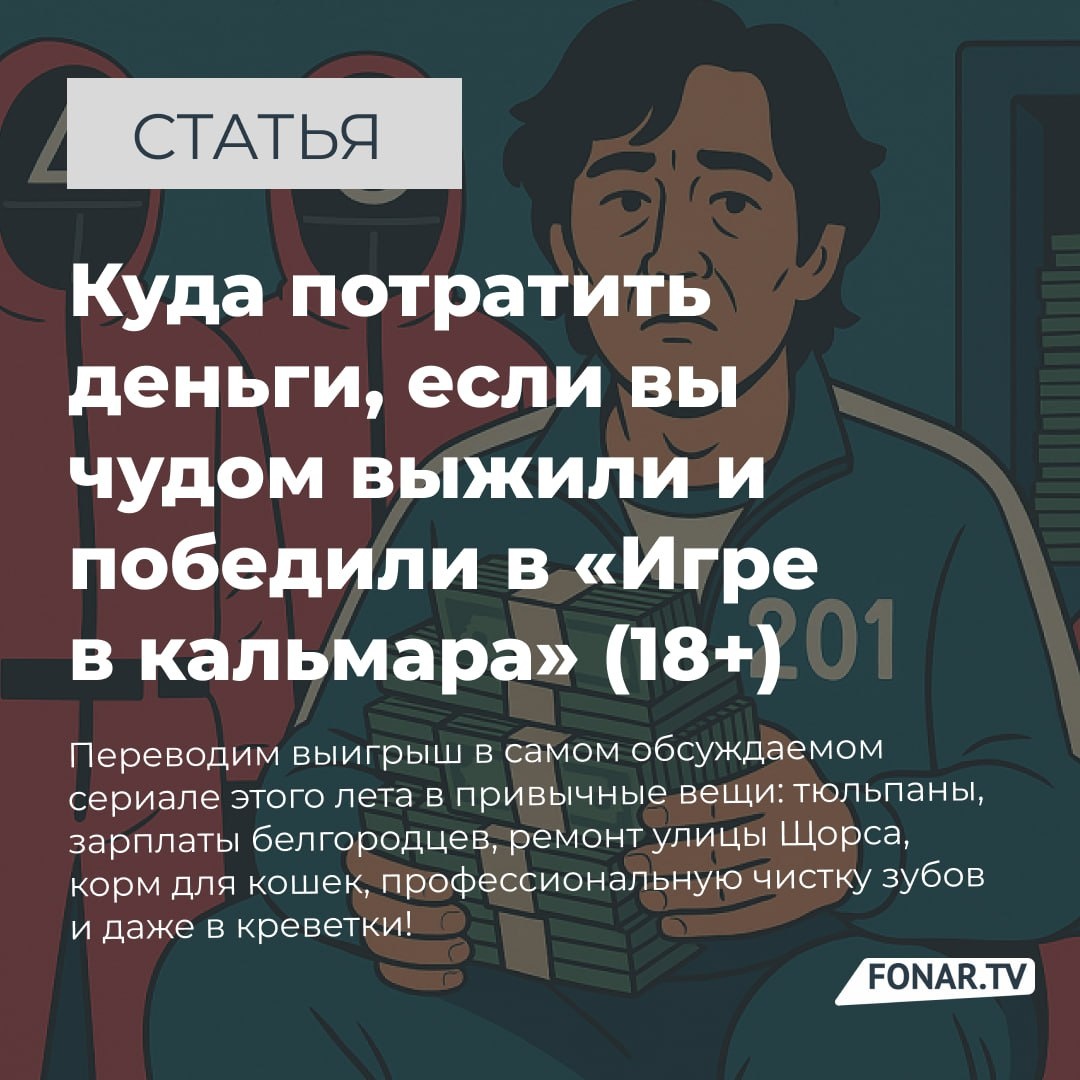 🎮 Выжить и победить в жестокой «Игре в кальмара» (18+). Что если вам повезло, и вы — единственный победитель, получивший 2,6 миллиарда рублей (это мы в рубли перевели выигрыш), что дальше? Мы подсчитали: столько можно заработать за 3829 лет труда, получая среднюю зарплату в Белгороде. Откладывать можно было бы с бронзового века. А ведь тогда, между прочим, на нашей земле паслись мамонты (не верите? Загляните сюда). 🏙 За эти деньги можно наконец-то сделать канатную дорогу в Белгороде, как мечтал один из мэров, обустроить целый город — с бесплатным Wi-Fi у каждого подъезда, чистыми трубами во всех кафе и сияющими улыбками у всех жителей. Можно кормить всех белгородцев креветками и рыбой, как на царском пиру, или завалить экватор тюльпанами (догадываемся, кому бы эта идея с 🌷понравилась!). А если душа просит романтики — снять однушку на 13,8 тысячи лет и медитировать на вечерние закаты всем вашим пра-пра-пра-пра-пра-пра-правнукам. 🐱 Цветы, интернет, зубы, фестивали, коты и «Белый к