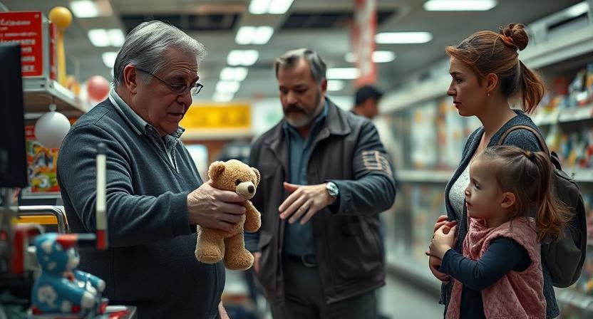 Михаил стоял перед прилавком с детскими игрушками, держа в руках небольшого плюшевого медвежонка. Рядом с ним маленькая девочка лет пяти тянула маму за рукав.