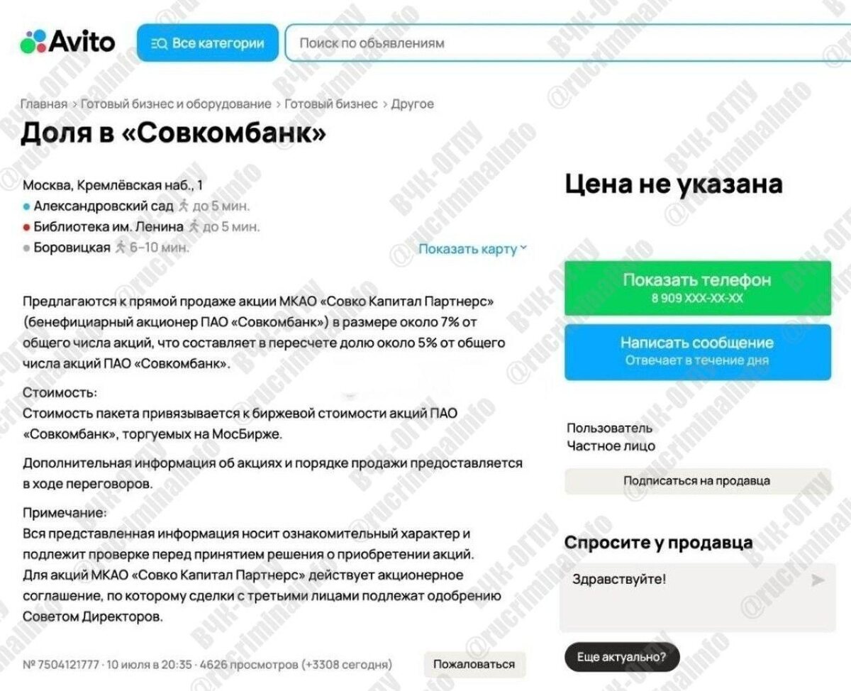 Интересно, что 5% доли в Совкомбанке продают на Авито