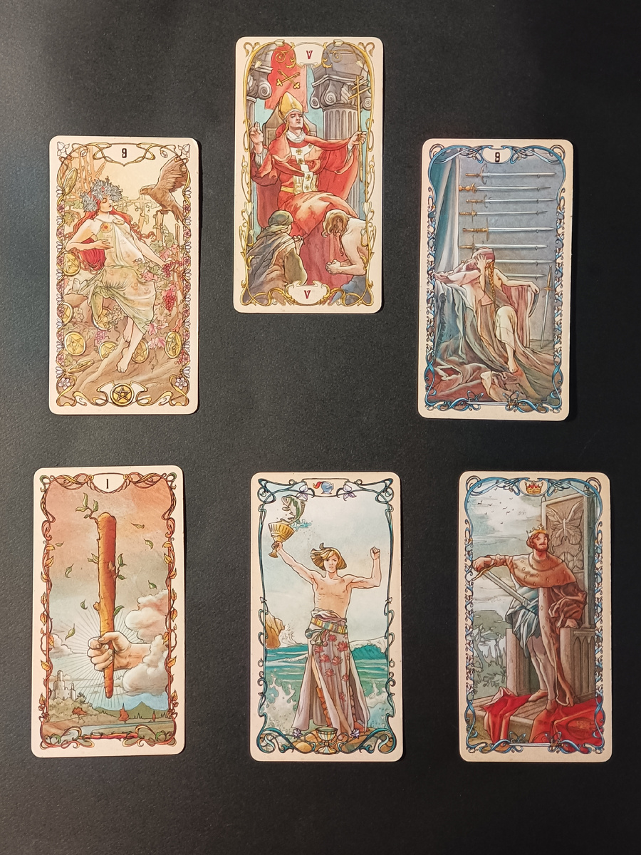 Приветствую вас на канале «Таро отношения» и сегодня предлагаю взглянуть на мысли, чувства и намерения мужчины в сторону вас. Настраивайтесь на карты, сделайте вдох-выдох, представьте загаданного мужчину и посмотрим, как карты видят в данный момент ваши отношения. Напоминаю, что это общий расклад, берите для себя только то, что откликается. Расклад сегодня на колоде «Таро Альфонса Мухи» Итак, вот такие карты вышли. Давайте рассмотрим каждую позицию отдельно 1. Роль девушки в отношениях – 9 пентаклей Карта отображает твою самодостаточность, уверенность в себе. Ты ценишь себя, свои личные границы, поэтому тебе важно иметь своё пространство и время, когда ты можешь побыть сама с собой. Посмотри на изображение, тут девушка больше сосредоточена на себе, на своём комфорте и красоте. Возможна ты несколько отстранена эмоционально от отношений и держишь дистанцию. Для тебя сейчас важнее наслаждение собой и своим внутренним миром. Возможно, через мужчину и эти отношения – ты поднимаешь свою само