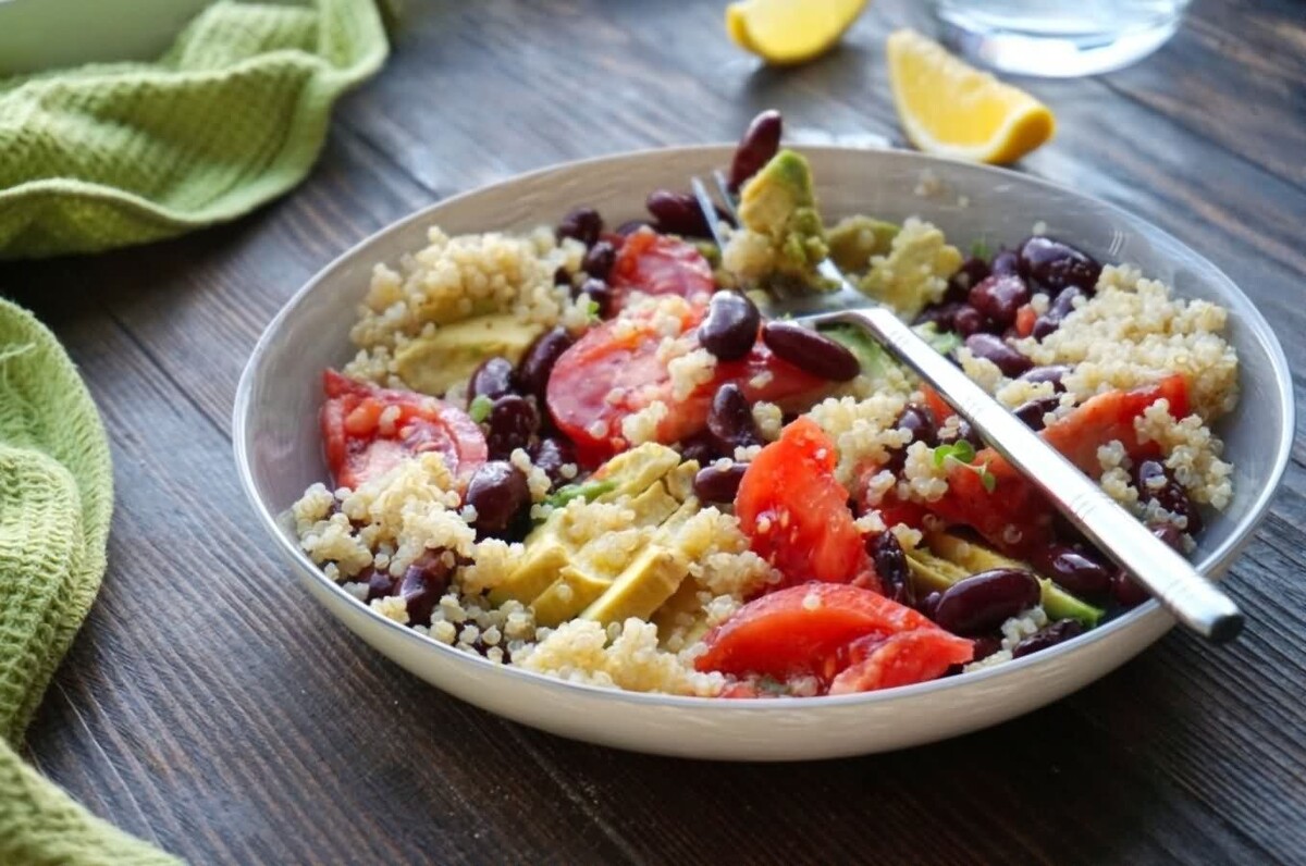Соедините в большой миске киноа, фасоль, кукурузу, черри, перец, лук и половину кинзы. Влейте заправку, аккуратно перемешайте лопаткой.