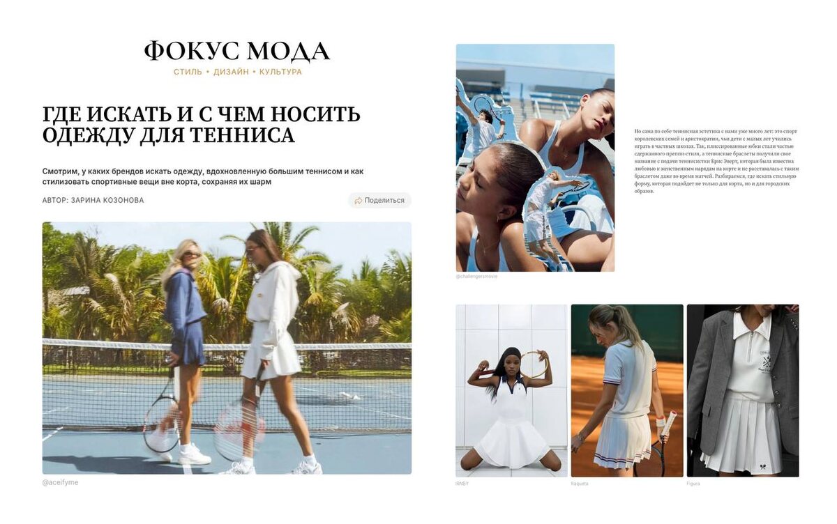 Эстетика большого тенниса давно вышла за пределы спортивных кортов — сегодня она покоряет подиумы, гардеробы и городские улицы. В новом материале «Фокус Мода» разбираемся, где искать стильную теннисную форму и как носить её в повседневной жизни. Плиссированные юбки, рубашки-поло, свитшоты на молнии, кепки и даже холщовые сумки с теннисным принтом — спорт стал новой модной классикой. «Я обожаю теннисные юбки, которые ношу с майками — это моя база для тенниса», — делится Ольга Бохан, экс-редактор Harper’s Bazaar и поклонница корта. А ещё советует: «Сделайте акцент на обуви — это куда важнее, чем одежда». Вдохновляемся Зендеей в «Претендентах», архивными образами принцессы Дианы и выбираем любимые бренды — от 2MOOD до Figura, от Raqueta до 7/6. Прочитайте статью, чтобы узнать: — Как вписать теннисную форму в городские образы. — Какие российские марки делают не просто «по мотивам», а по-настоящему функциональные вещи. — И почему теннис — это не просто тренд, а образ жизни. Читать на f