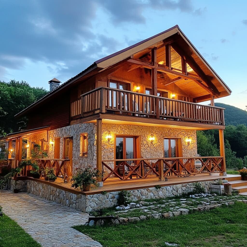 Этот современный гостевой комплекс выполнен в стиле альпийского шале: деревянные домики с панорамными окнами, тёплое освещение и виды, которые создают атмосферу Швейцарии или Австрии, только с видами на Кавказский хребет.