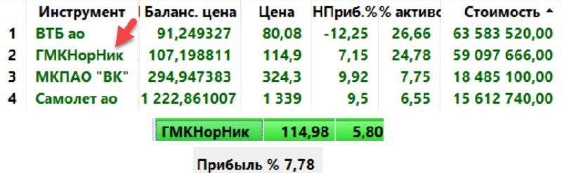 ‼️Про палладий с утра не просто так вам скидывал. Секрет роста портфеля на 8% сегодня - ставка на ГМК. А те кто внимательно смотрел видео с бесплатным обучением по симметриям, понимают почему он растёт в том числе технически (полная логика скидывалась в клубе и доступном для всех видео по бумагам там и про фундаментал тоже). Подписчикам клуба же (https://t.me/SubProfitGateBot) стоит обратить внимание, на дополнительное видео по симметриям, которое я скидывал исключительно в клуб с дополнительными признаками улучшающими отработку этих паттернов. ☝️Ну а ГМК, вторая по объёму позиция в моём портфеле, после ВТБ который с учётов дивов тоже сильно растёт. На скрине 4 бумажки представляющие собой две трети портфеля по объёму сейчас.