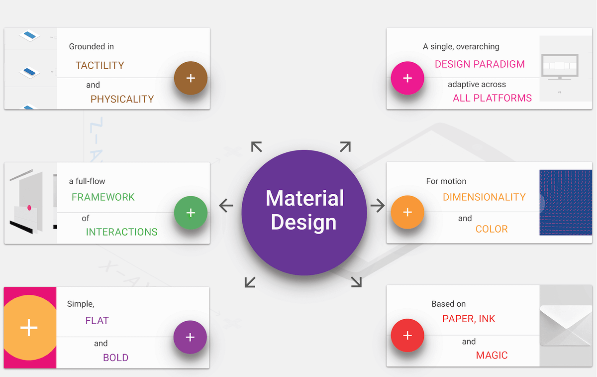 Физические поверхности и тени: Элементы интерфейса выглядят как физические объекты с тенями, что создает ощущение глубины и помогает пользователю понять, как взаимодействовать с интерфейсом.
