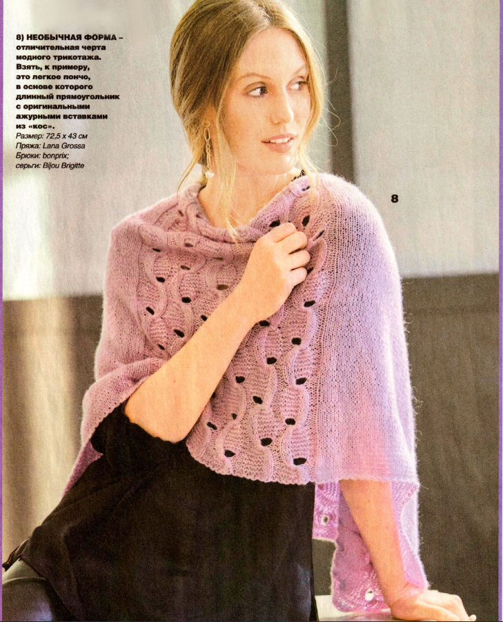 1. Пончо - накидка 2. Палантин с узором "Листья" 3. Треугольный ажурный платок 4. Бактус укороченными рядами 5. Треугольный ажурный платок 5. Платок с миксом узоров 6. Треугольный платок платочной вязкой 7. Платок с диагональным узором 8. Платок - шарф с прорезью 9. Наплечный платок - шарф 10. Ажурная стола 11. Шарф - снуд 12. Стола с декором из ажурных кос 13. Кейп с капюшоном 14. Снуд с бахрамой в виде шнура "ай-корд" Приглашаю Вас на мои площадки, где Вы найдете: