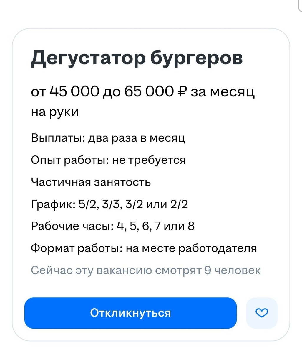 Дегустатора бургеров ищут в Питере. Сеть ресторанов Стейк & Бургер ждёт истинного босса котлеток, чья задача — пробовать мясные позиции, подробно описывая ощущения. Кандидату на место предложат гибкий график, высокую зпшку и возможность регулярно удовлетворять свои вкусовые сосочки. Коллеги, в офисе не ждите.