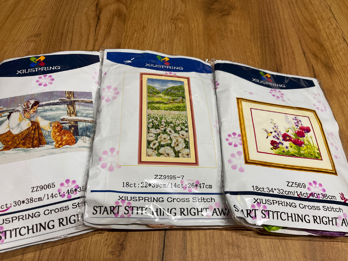 Три новых набора — пополнение моей коллекции со скидкой Ко мне приехали три набора от Xiuspring. Все они были куплены по очень хорошей скидке, да ещё и с бесплатной доставкой — пройти мимо было невозможно. Наборы недорогие, аккуратно укомплектованы: канва, нитки, схема, иголка — всё на месте. Такие приятно держать в руках и добавлять в коллекцию. Первый сюжет — зимний: девушка в платке наклоняется к рыжей кошке. У меня сразу щёлкнуло внутри: дома живёт рыжий кот, да и вообще я постоянно глажу всех котов подряд — и своих, и уличных. Девушка на картинке чем-то похожа на меня. Кто автор оригинала — пока не знаю. Может, кто-то узнает? Есть ощущение, что это может быть российский производитель. Второй набор — цветочный пейзаж с белыми цветами и холмами вдали. Это реплика набора от Ankor. У меня есть все панельки этой серии, потому что это именно серия панелек. Особенно хотелось именно этот набор с розовыми маками — нигде не могла его найти, а мне хотелось иметь всю коллекцию. Поэтому я ег