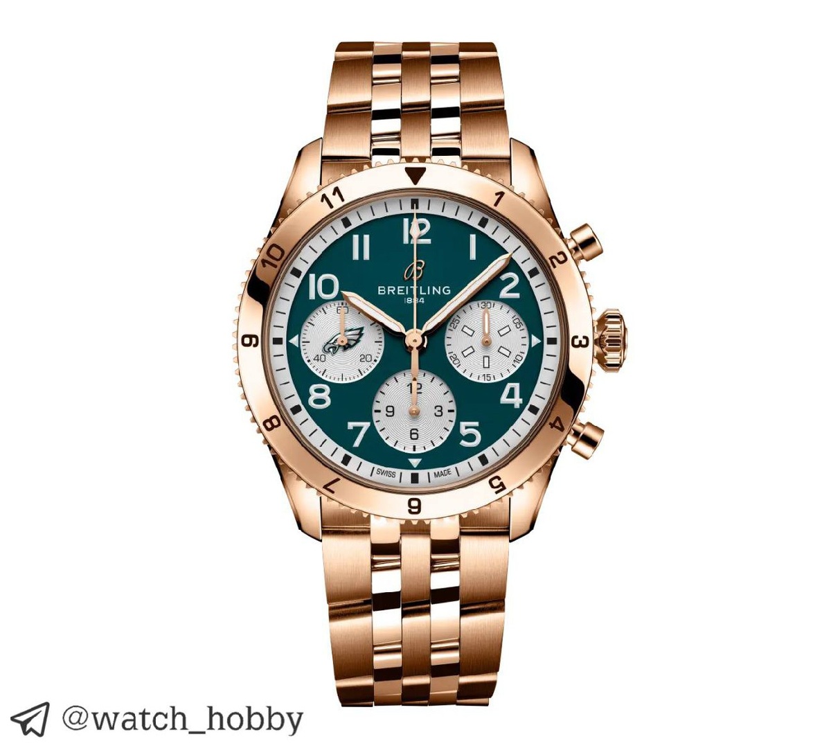 Лимитированная новинка Breitling AVI Chronograph 42 Super Bowl LIX Philadelphia Eagles Limited Edition. Часы, достойные чемпионов. Breitling празднует победу команды Philadelphia Eagles в Суперкубке 🏆 Что с характеристиками: - Корпус из 18-каратного золота - Браслет из 18-каратного золота - Диаметр корпуса: 42 мм - От ушка до ушка: 48 мм - Высота корпуса: 14.7 мм - Вес: 243.8 грамм - Зеркальная и сатиновая полировка - Сапфировое стекло с антибликом - Водозащита 100 метров - Хронограф - Автоматический механизм Breitling 23 Золотой корпус дополняет циферблат фирменного темно-зеленого цвета команды, а счетчики хронографа сделали белыми. Логотип «Орлов» поместили на «9 часов». Задняя крышка получила гравировку официального логотипа Super Bowl. Тираж ограничен 59 экземплярами в честь 59 по счету Суперкубка, каждый получил индивидуальный порядковый номер. Лайфхак по сохранению 20.000 долларов - не выпендриваемся и берем часы на кожаном ремешке 😂 Лимит: 59 экземпляров. Стоимость: 41.
