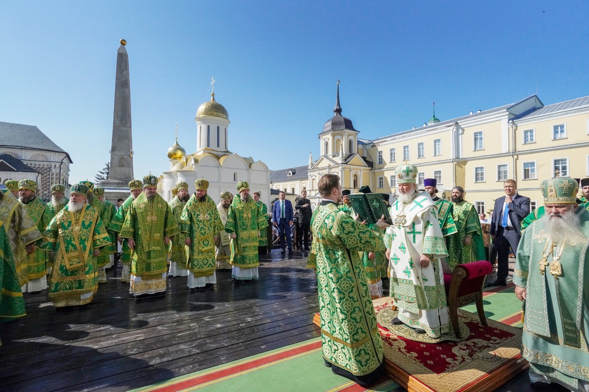 Его Святейшеству за Литургией сослужили: митрополит Ташкентский и Узбекистанский Викентий, глава Среднеазиатского Митрополичьего округа; митрополит Санкт-Петербургский и Ладожский Варсонофий; митрополит Крутицкий и Коломенский Павел, Патриарший наместник Московской митрополии; митрополит Минский и Заславский Вениамин, Патриарший экзарх всея Беларуси; митрополит Воскресенский Григорий, управляющий делами Московской Патриархии, первый викарий Святейшего Патриарха Московского и всея Руси по г. Москве; митрополит Волоколамский Антоний, председатель Отдела внешних церковных связей Московского Патриархата; митрополит Владимирский и Суздальский Никандр, председатель Финансово-хозяйственного управления Московского Патриархата; митрополит Липецкий и Задонский Арсений; митрополит Уфимский и Башкортостанский Никон; митрополит Томский и Асиновский Ростислав; митрополит Тобольский и Тюменский Димитрий; митрополит Серафим (Зализницкий); митрополит Иваново-Вознесенский и Вичугский Иосиф; митрополит Балтийский и Светлогорский Серафим; митрополит Курганский и Белозерский Даниил; митрополит Каширский Феогност, председатель Синодального отдела по монастырям и монашеству, наместник Донского ставропигиального мужского монастыря г. Москвы; митрополит Тамбовский и Рассказовский Феодосий; митрополит Нижегородский и Арзамасский Георгий; митрополит Симбирский и Новоспасский Лонгин; митрополит Рязанский и Михайловский Марк; митрополит Тверской и Кашинский Амвросий; митрополит Луганский и Алчевский Пантелеимон; митрополит Ставропольский и Невинномысский Кирилл, председатель Синодального отдела по взаимодействию с Вооруженными силами и правоохранительными органами, председатель Синодального комитета по взаимодействию с казачеством; ; eпископ Сергиево-Посадский и Дмитровский Кирилл, наместник Свято-Троицкой Сергиевой лавры, ректор Московской духовной академии; епископ Раменский Алексий, личный секретарь Святейшего Патриарха Кирилла; собор архиереев Русской Православной Церкви; насельники Троице-Сергиевой лавры и подворий обители в священном сане; духовенство г. Москвы.