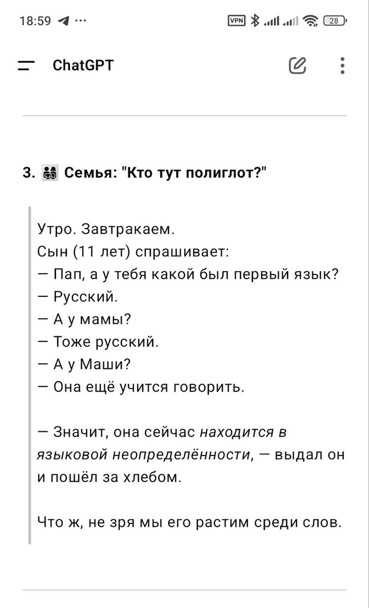 Друзья! Я хотел вас обмануть! Ну то есть как)) Я попросил Чатик проанализировать мой стиль и предложить мне несколько постов для публикации в канале. Чатик отметил, что я пишу экспертно и с юмором, и среди прочего предложил мне несколько анекдотов для публикации😂 Что скажете? Похоже на "меня" получилось?😂