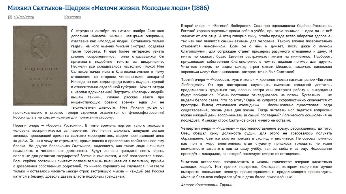 Михаил Салтыков-Щедрин "Мелочи жизни. Молодые люди" (1886) | Критика