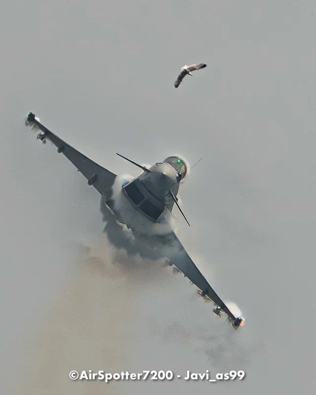 Детальные кадры столкновения Eurofighter Typhoon с птицей в Испании Сообщается, что столкновение произошло когда самолет был на грани звукового барьера во время выступления на фестивале Aire2025, так что несмотря на малый размер птицы, сила удара была колоссальная. Можно с уверенностью сказать, что летчику повезло отделаться лишь запачканной формой и шлемом. Птичку жалко©