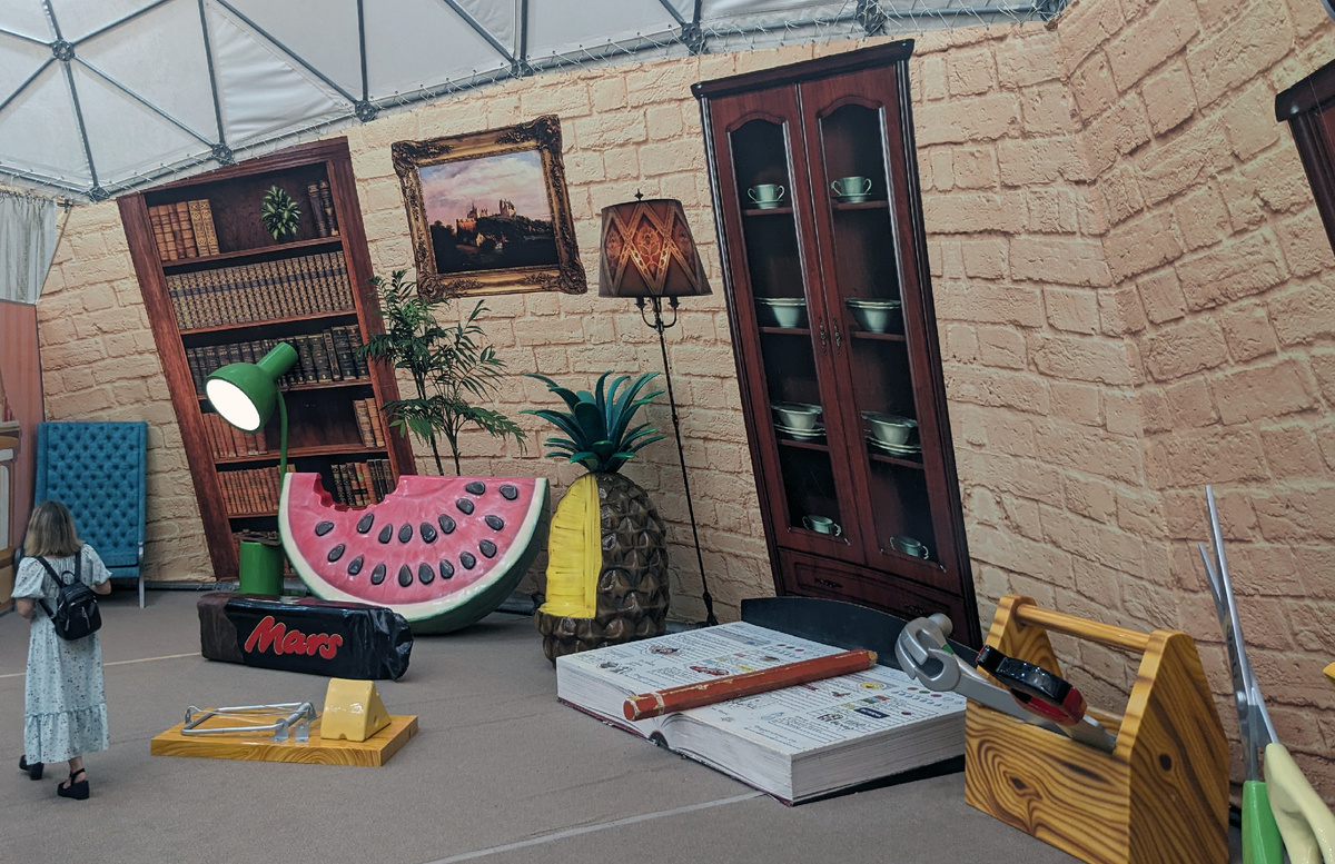Забавный мини-музей в парке Ривьера представляет собой несколько интерьеров с наставленными вокруг непропорционально огромными предметами. Тут можно залезть в микроволновку к курице, которая там почему-то готовится, "оседлать" шоколадный батончик или примерить ботинки пятисотого размера.