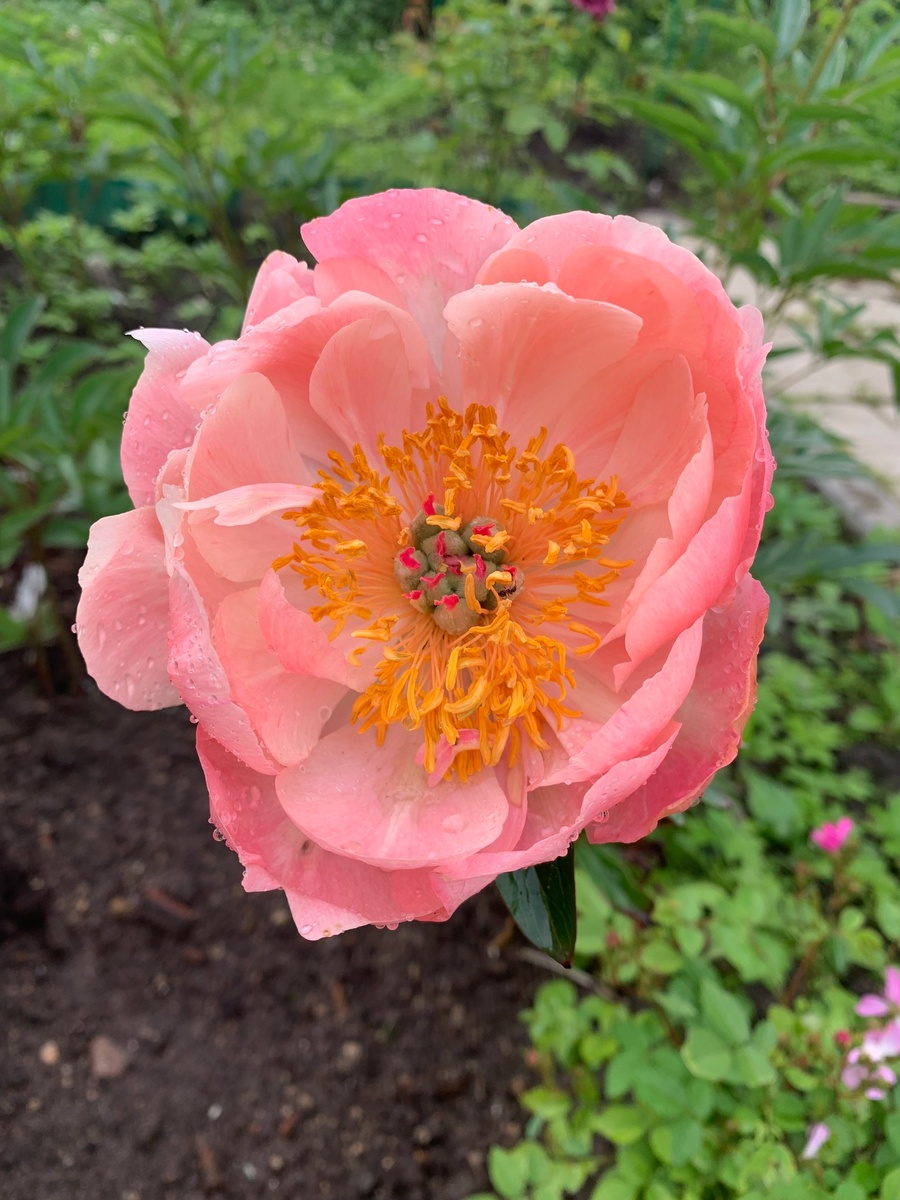 Одной из новинок пионов посажен пион травянистый Корал Шарм. Выбираю сорта по настроению, захотелось цветок коралловой расцветки. Этот пион очень внешне схож с пионом Корал Сансет. Но у пионов есть отличия по габитусу куста или насыщенности цвета, которые не профессионалу можно и не определить внешне по цветку.