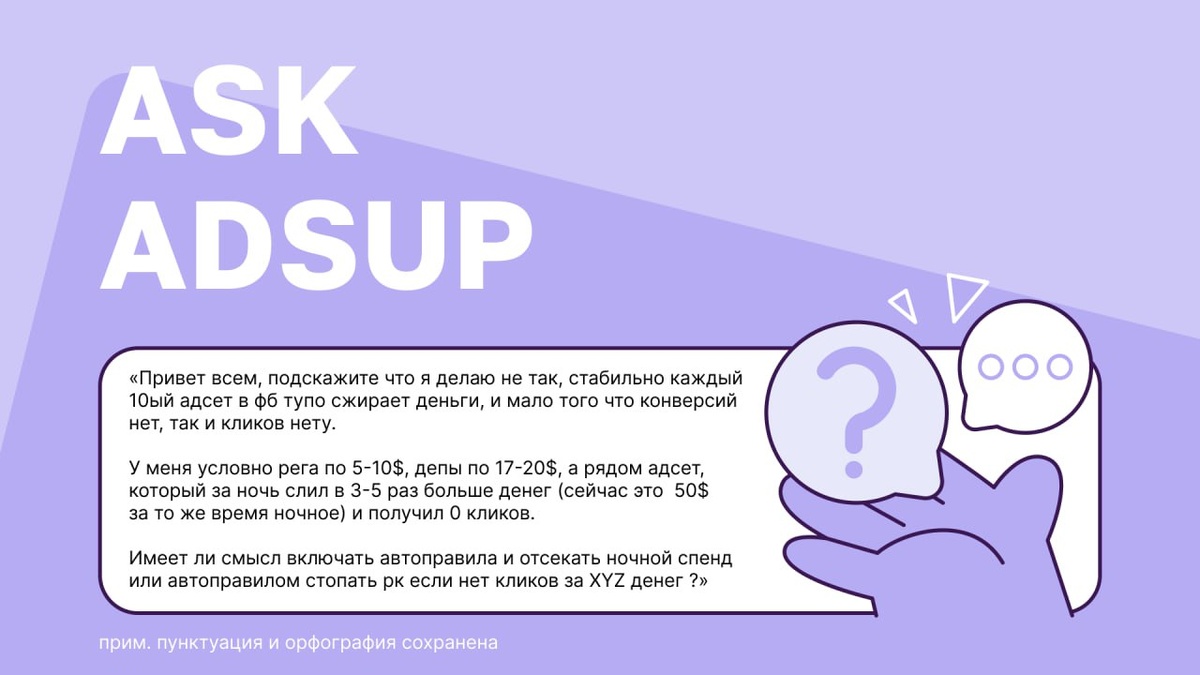 Возвращаем рубрику Ask Adsup, но на новых условиях! Раньше разбирали типичные ошибки в рекламных кампаниях. Теперь решили прокачать формат и отвечать на реальные вопросы из чатов по мобильному маркетингу — коротко и понятно. Первый кейс — классика жанра: почему одни адсеты в Facebook* сливают бюджет в пустоту, а другие при тех же настройках работают нормально? Ниже — причины и что с этим делать. «Подскажите что я делаю не так, стабильно каждый 10 адсет в фб* тупо сжирает деньги, и мало того что конверсий нет, так и кликов нету». Как это исправить? Используй динамическую оптимизацию или тестируй несколько маленьких изменений в одном из адсетов, чтобы увидеть, какие элементы работают лучше. Например, меняй порядок креативов или включай/выключай таргетинг по возрасту, полу или интересам. «У меня условно рега по 5-10$, депы по 17-20$, а рядом адсет, который за ночь слил в 3-5 раз больше денег (сейчас это 50$ за то же время ночное) и получил 0 кликов» Как это исправить? Дай кампании бо