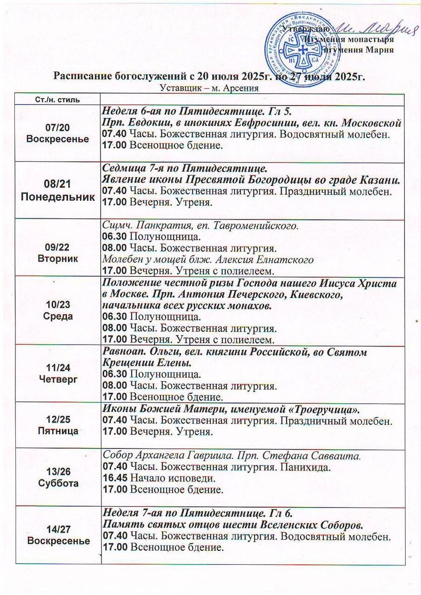 20-27.07. Расписание богослужений в Введенском женском монастыре г. Иваново