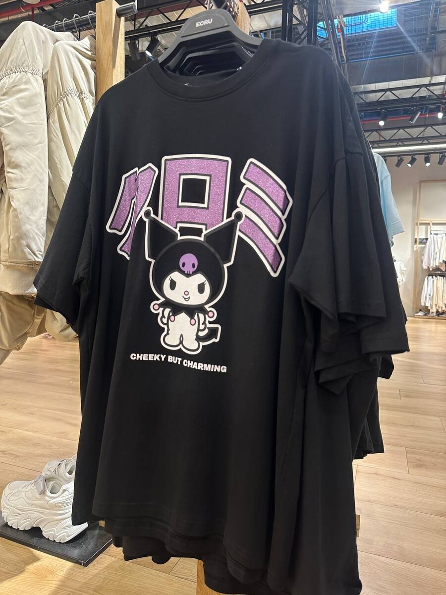 Футболки и носки с Куроми из вселенной Hello Kitty найдены в ECRU (бывшая Bershka)! В магазинах есть чёрные и серые футболки и два вида носков. Идеальный наряд для похода во Вкусноточку 😸