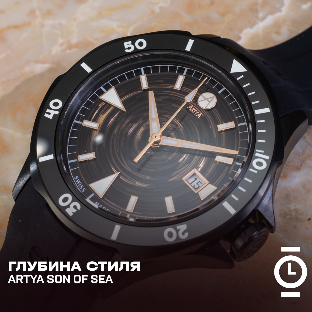 ГЛУБИНА СТИЛЯ: ARTYA SON OF SEA #обзор_WD Швейцарская компания ArtyA, основанная Иваном Арпа, объединила в новой коллекции Son of Sea художественный подход и полноценную функциональность. Эти часы — не просто арт-объект, а настоящий дайверский инструмент. Корпус диаметром 43 мм выполнен из нержавеющей стали — в классическом варианте или с чёрным DLC-покрытием. Толщина чуть более 13 мм, установлено куполообразное сапфировое стекло с антибликовым покрытием. Водонепроницаемость — до 300 метров. Расстояние от ушка до ушка — около 50 мм, посадка на запястье комфортная. Безель вращается в одну сторону, имеет рельеф в форме морской волны и вставки из керамики разных цветов: чёрного, синего, зелёного, красного или золотого. Задняя крышка украшена гравировкой акульей пасти, её оформление зависит от установленного механизма. Доступны две версии: с швейцарским механизмом ArtyA AION COSC (частично открытая крышка, 4 Гц, 48 часов запаса хода, сертифицирован как хронометр) и с La Joux-Perret G10