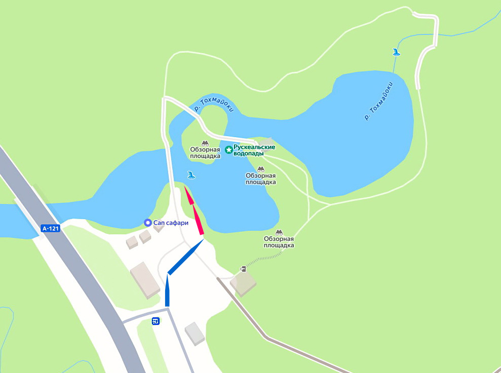 Продолжаем осматриваться на площади перед входом на экологическую тропу Рускеальских водопадов, на которую прибыли из горного парка «Рускеала» в предыдущей статье. Площадь расположена на левом берегу реки Тохмайоки, отсюда можно рассмотреть три водопада из четырёх. Мы находимся на юго-западе залива, ограниченного двумя полуостровами с запада и востока. Один водопад вспенивает воду между западным полуостровом и островом, два других находятся между островом и правым берегом Тохмайоки. Обзор начнём с правой, юго-восточной стороны – тихая заводь, куда не доходит волнение от водопада. Взгляд на полуостров. На берегу виден деревянный домик, он был построен в 2010 году во время съёмок фантастического триллера «Тёмный мир» Антона Мекердичева. Тот же пейзаж в 2014 году. Одна из декораций «Тёмного мира» – деревянная избушка, стоит без окон, без дверей, ещё не построена экологическая тропа. Первый водопад, который мы рассмотрим с «противоположного берега», расположен около избушки из «Тёмного мир