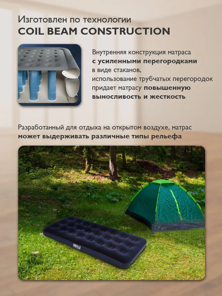 и внутренние пружинные балки имитируют мягкость и ощущение стандартного матраса. Надувной матрас - 1шт., инструкция - 1шт., самоклеящаяся заплатка - 1шт. Описание: Надувной односпальный матрас Single-High сделает ваш отдых комфортным и приятным. Размер: 99х191х25 см. Эта модель характеризуется особой прочностью, удобством и долгим сроком службы, которые обеспечивает технология Fiber-Tech. В качестве внутренних перекрытий используются не перегородки из ПВХ, а тысячи прочных полиэфирных волокон-нитей, соединяющих изнутри верх и основание надувного матраса, поэтому он не провисает и сохраняет форму. Плюшевая поверхность приятна на ощупь, легко чистится, не пропускает влагу, предотвращает сползание постельного белья. Стильный и комфортный надув