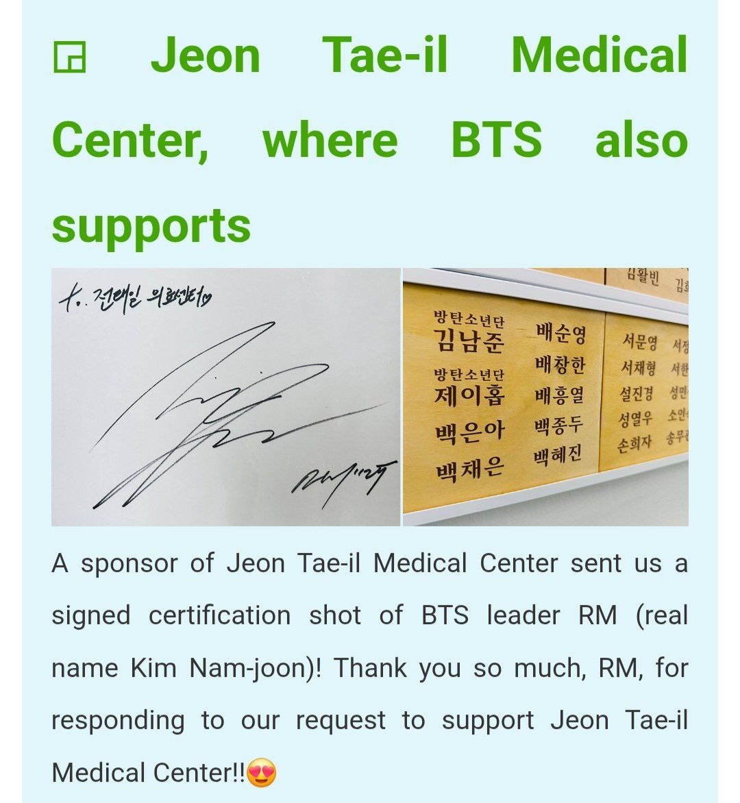 BTS были упомянуты в кампании по сбору средств для открытия «Центра психического здоровья» в центре Сеула в конце этого года, организованной Медицинским центром имени Чон Тэиля! «Один из спонсоров Центра прислал фото с автографом лидера BTS RM! RM ответил на просьбу поддержать Медицинский центр Чон Тэиля. Мы ему очень благодарны! Влияние добрых дел BTS уже дошло до больницы Green Hospital. Когда новости о нашей благотворительной работе по поддержке уязвимых групп, которые не получали своевременного лечения, распространились, фанаты BTS тоже узнали об этом и начали перечислять пожертвования под именами «BTS Ким Намджун» и «BTS Джей-Хоуп». После старта кампании по строительству Центра Чон Тэиля фанаты присоединяются к комитету под именами «보라해 (BTS ARMY)», «BTS 아미» и др. Ранее Мин Юнги, пожертвовал 5 млрд. вон, на открытие Медицинского центра для лечения и поддержки детей аутистов. Юнги принимал активное участие в разработке и создании программы Mind, сам играл детям на гитаре, помога