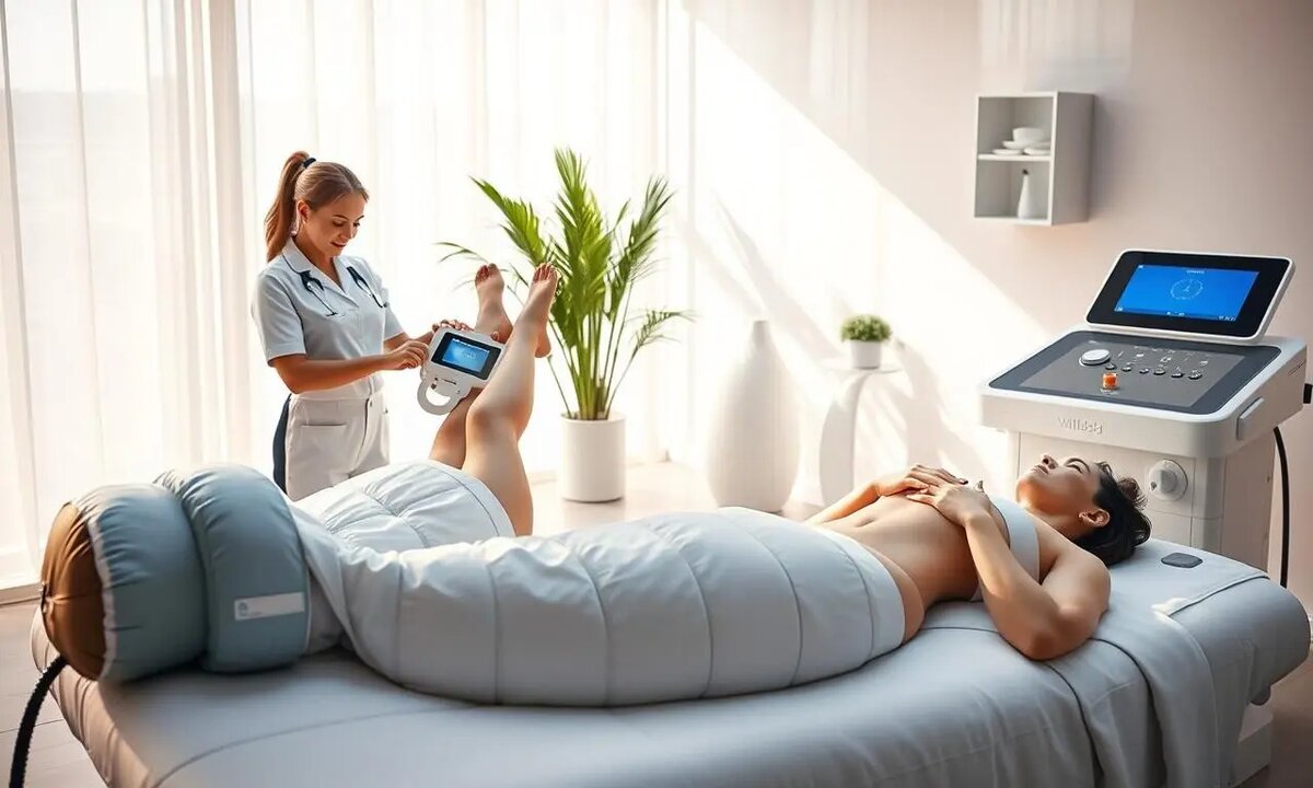 - Прессотерапия:Улучшает кровообращение и лимфодренаж