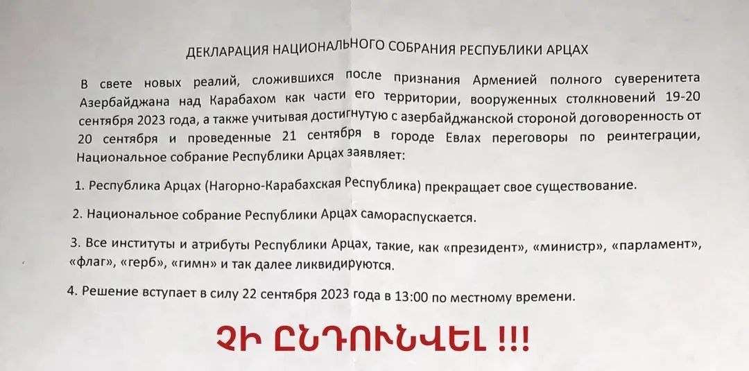 ⚡️⚡️⚡️ Արցախցի փաստաբան Ռոման Երիցյանը հրապարակել է ահաբեկիչ Ալիևի ռեժիմի կողմից Արցախի նախագահ Սամվել Շահրամանյանին ուղարկված վերջնագիրը, որը գրողի ծոցն է ուղարկվել. «Ստորև ներկայացնում եմ ռուսալեզու բացառիկ փաստաթուղթ, որն Ադրբեջանի ղեկավարության կողմից ուղղվել է Արցախի նախագահ Սամվել Շահրամանյանին՝ Ազգային ժողով ներկայացնելու և ընդունելու պահանջով։ Սամվել Շահրամանյանը, գիտակցելով նման քայլի իրավաքաղաքական և պատմական հետևանքները, մերժել է հռչակագրի ընդունման գործընթացը՝ պատճառաբանելով, որ պատգամավորական քվորում ապահովել հնարավոր չէ։ Իր հերթին Ադրբեջանի ղեկավարությունը, չնահանջելով իր պահանջից, շարունակել է այն պնդել։ Հաշվի առնելով բնակչության ոչնչացման ու սպանդի վտանգը, որպես այլընտրանք, նախագահն ընդունել է հրամանագիր Արցախը լուծարելու վերաբերյալ՝ քաջ գիտակցելով, որ ի տարբերություն հռչակագրի՝ այն որևէ իրավական ուժ չի ունենալու և հետագայում ճանաչվելու է անվավեր։ Ուշագրավ է նաև, որ հրամանագրում Հայաստանի Հանրապետության կողմից Արցախն Ադրբեջանի մաս ճանաչելու վերաբերյալ որևէ հիմնավորո