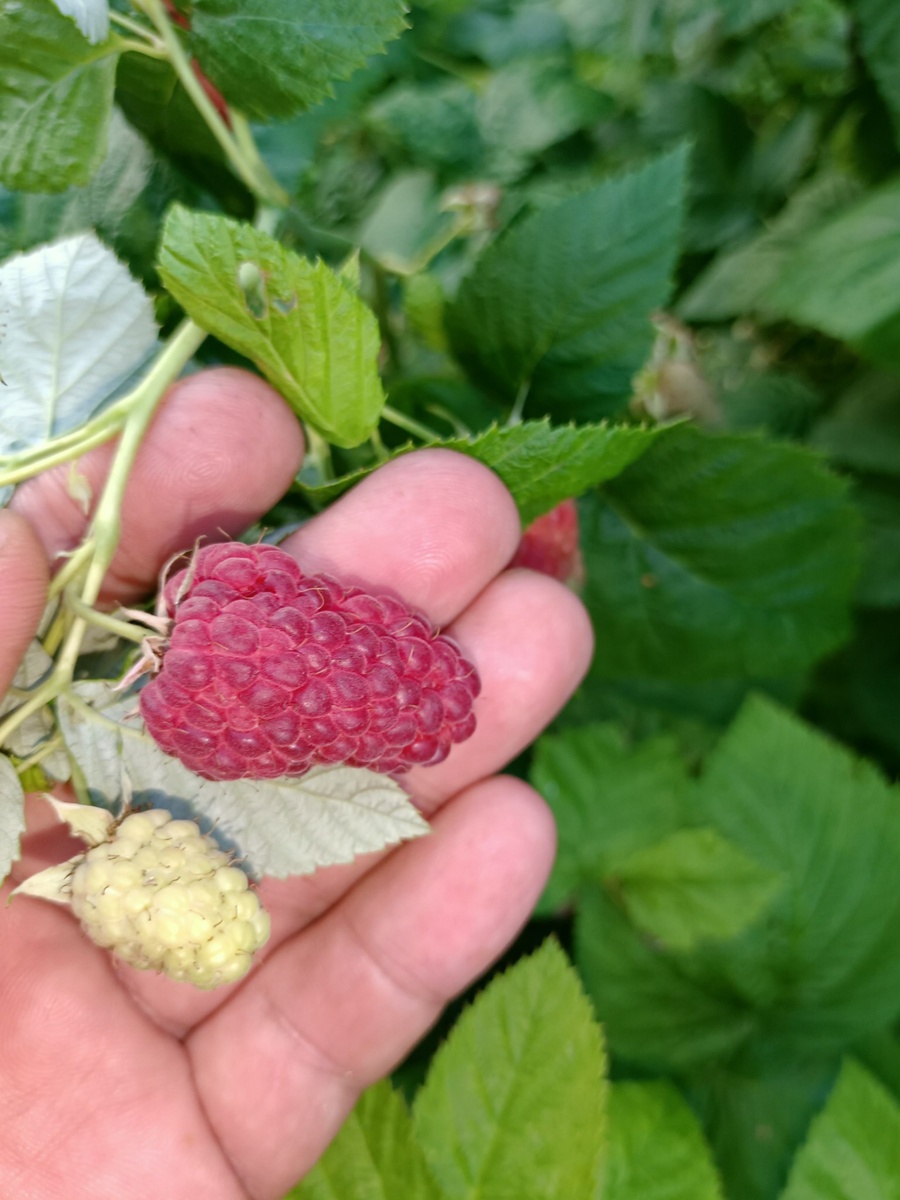 Малина «Гордость России». Ягода пошла. Два моих пальца это 4 см.