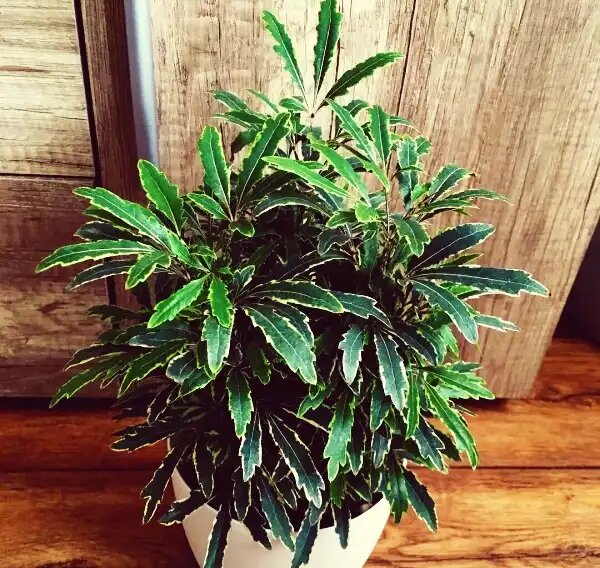Дизиготека цветок — декоративный кустарник с изящно рассеченными темно-зелеными листьями, напоминающими пальчатые резные пластины. Компактная форма и контрастная окраска делают растение привлекательным и необычным.