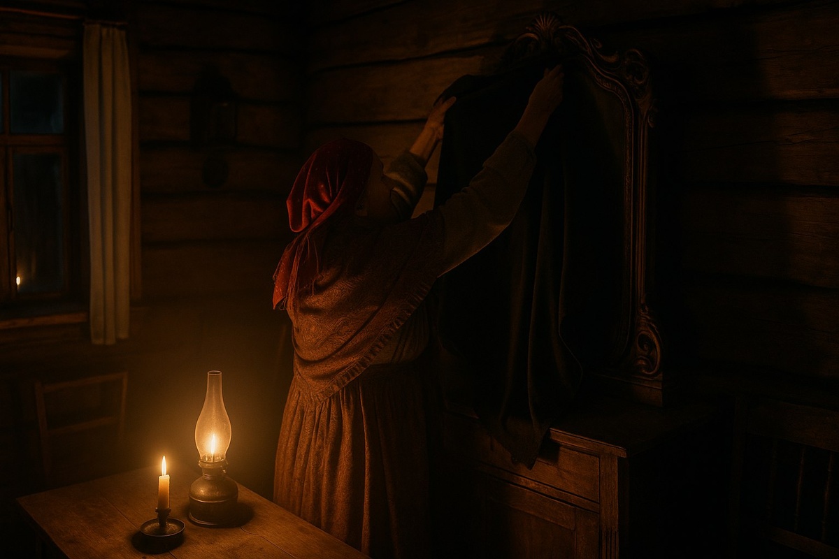 Представь старинный дом где-то в русской деревне. Горит керосиновая лампа, за окном воет ветер. И вот хозяйка дома берет черную ткань и накрывает большое зеркало в прихожей. Потом идет в спальню — там еще одно. На кухне маленькое зеркальце — и его тоже. Ни одного не пропустит.